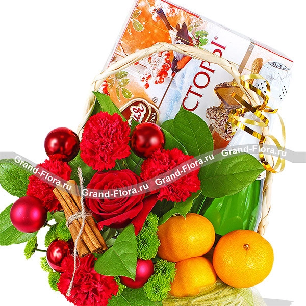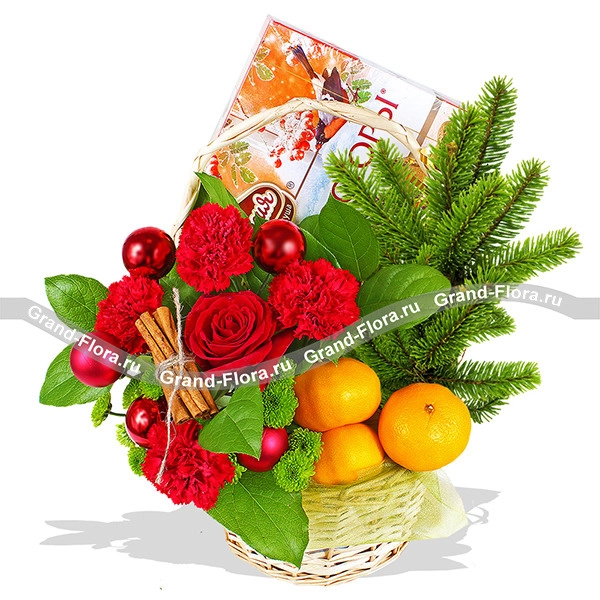 Стандартный (на фото): гвоздика - 4шт., роза красная - 1шт., хризантема зеленая (сантини) - 1шт., корица, мандарины - 1кг., конфеты "Родные просторы" (278 г.) - 1шт., еловая ветвь - 1шт., новогодний декор и зелень, желтый фетр, оазис, корзина средняя.