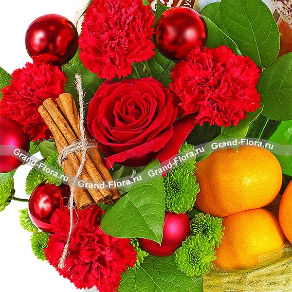 ЛЮКС: гвоздика - 5шт., роза красная - 1шт., хризантема зеленая (сантини) - 2шт., корица, мандарины - 1,5кг., конфеты "Родные просторы" (278 г.) - 1шт., еловая ветвь - 2 шт., новогодний декор и зелень, желтый фетр, оазис, корзина средняя.