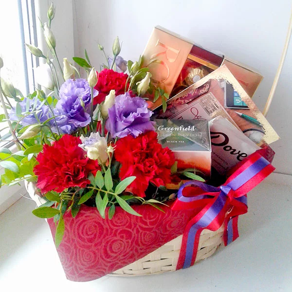 ДЕЛЮКС: шоколад "DOVE" - 2 шт., чай "Greenfield" - 1 шт., конфеты "Ferrero Rocher" - 1 шт., эустома - 4 шт., гвоздика - 5 шт., декоративная зелень, оазис, корзина малая, красно-фиолетовый бант, фетр.