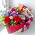 ЛЮКС: шоколад "DOVE" - 1 шт., чай "Greenfield" - 1 шт., конфеты "Ferrero Rocher" - 1 шт., эустома - 4 шт., гвоздика - 5 шт., декоративная зелень, оазис, корзина малая, красно-фиолетовый бант, фетр.