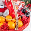 Стандартный(на фото): Coca-Cola - 2 шт., киндер подарок "Maxi Mix" - 223 г., мандарины - 2 кг., апельсины - 1 кг., игрушка "Мишка" до 30 см., декор, корзина большая.